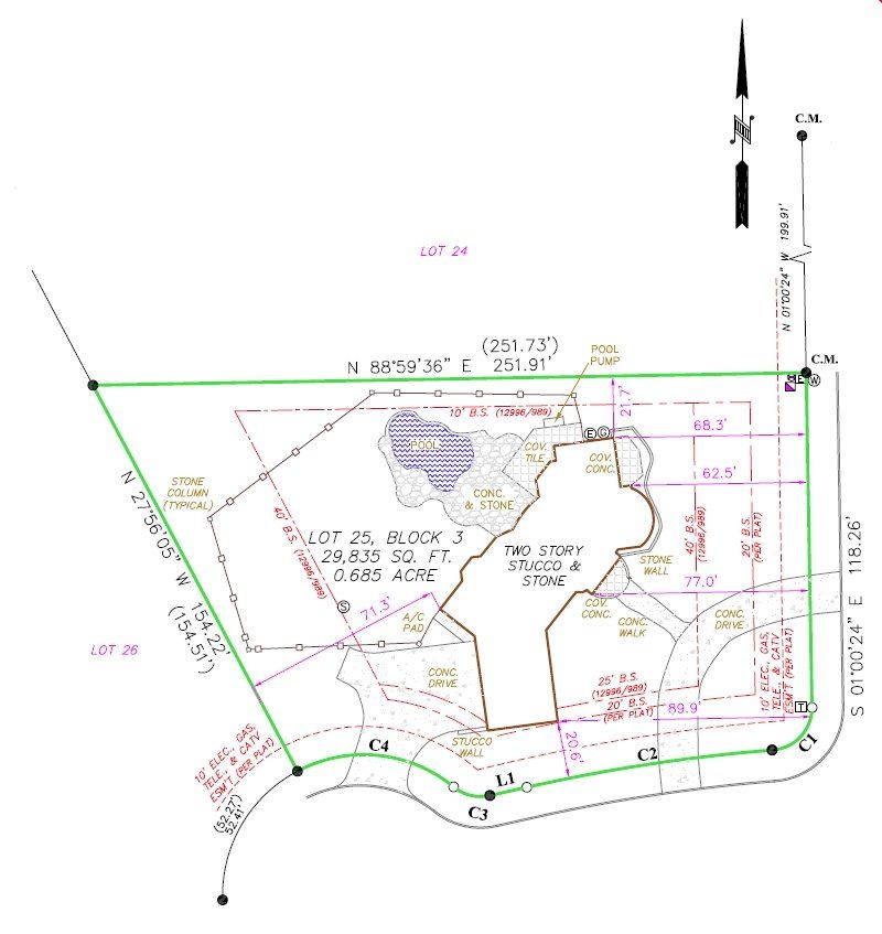 An as-built survey is generally the first survey of a property after specific improvements have been constructed on the property. This survey shows the owner, the Title Company and the Lending Institution the location of all improvements in relation to the property lines, known setbacks, and known easements.